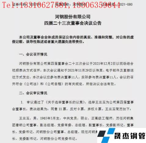 12月3日河鋼股份有限公司(以下簡稱河鋼股份)發(fā)布了第四屆二十三次董事會決議公告,據(jù)該公告顯示,河鋼股份第四屆董事會二十三次會議于2021年12月2日以現(xiàn)場結(jié)合視頻表決方式召開,會議審議并通過了《關于選舉董事長的議案》,選舉王蘭玉為公司第四屆董事會董事長。