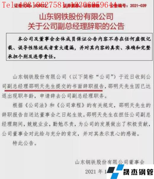 12月1日,山東鋼鐵發(fā)布公告稱,于近日收到公司副總經(jīng)理邵明天先生提交的書面辭職報告。邵明天先生因已達退出現(xiàn)職年齡,申請辭去公司副總經(jīng)理職務。