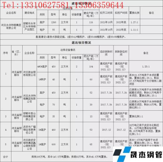 河北新金鋼鐵有限公司退出450m3高爐2座,產(chǎn)能104萬噸/年;40t轉(zhuǎn)爐1座,產(chǎn)能60萬噸/年。河北永洋特鋼集團有限公司退出450m3高爐1座,產(chǎn)能52萬噸/年;70t電爐1座,產(chǎn)能30萬噸/年。邯鄲市紫山特鋼集團有限公司退出35t電爐1座,產(chǎn)能13萬噸/年。武安市廣耀鑄業(yè)有限責(zé)任公司退出460m3高爐1座,產(chǎn)能53萬噸/年。河北新武安鋼鐵集團鑫山鋼鐵有限公司退出600m3高爐1座,產(chǎn)能65萬噸/年。