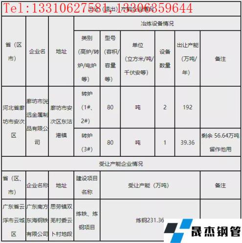 1月12日,河北工信廳發(fā)布變更廊坊市洸遠(yuǎn)金屬制品有限公司部分產(chǎn)能出讓方案。方案表明,廊坊市洸遠(yuǎn)金屬制品有限公司擬出讓80t轉(zhuǎn)爐3座給廣東南方東海鋼鐵有限公司,共計出讓煉鋼產(chǎn)能231.36萬噸,剩余56.64萬噸留作他用。
