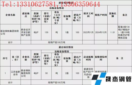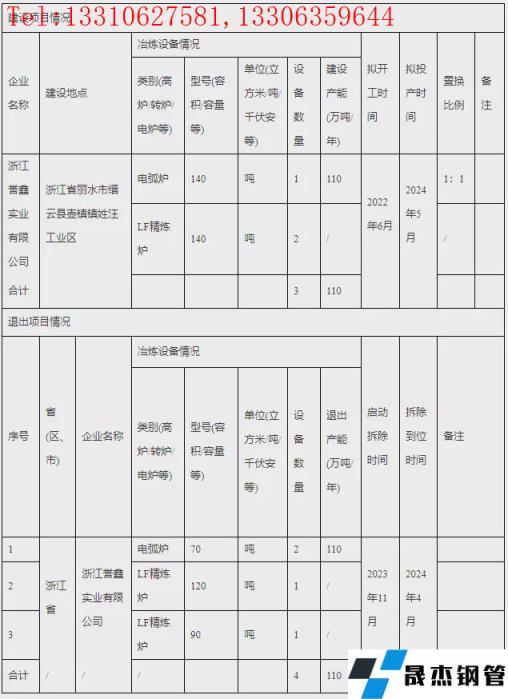 2022年1月7日,浙江省經(jīng)信廳發(fā)布浙江譽鑫實業(yè)技術(shù)改造升級建設(shè)項目產(chǎn)能置換方案。方案顯示,浙江譽鑫實業(yè)有限公司擬于2022年6月新建140t電弧爐1座和140tLF精煉爐2座,產(chǎn)能110萬噸/年,項目預(yù)計2024年5月投產(chǎn)。同時退出70t電弧爐2座、120tLF精煉爐1座和90tLF精煉爐1座,共計退出產(chǎn)能110噸。項目于2023年11月啟動拆除,并于2024年4月拆除到位。