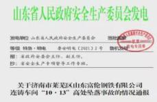 事故情況:濟南市萊蕪區(qū)山東富倫鋼鐵有限公司連鑄車間發(fā)生人員高處墜落事故,造成3人死亡、1人受傷。