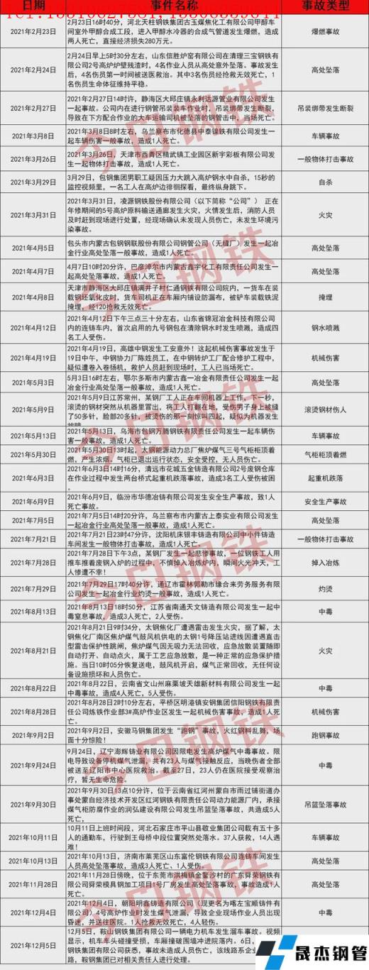 當前安全生產(chǎn)工作正處于關(guān)鍵時期,鋼鐵企業(yè)要嚴防安全風險因素的產(chǎn)生?;仡?021年小編將一些具有代表性的安全事故案例匯編如下: