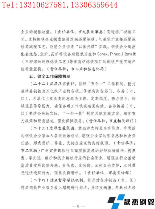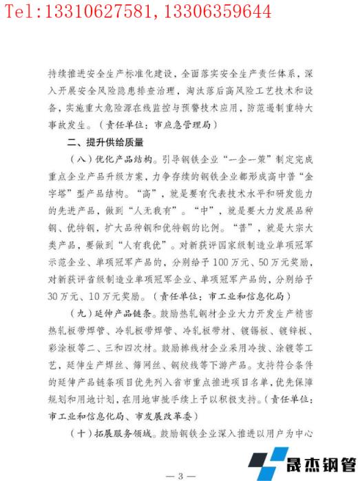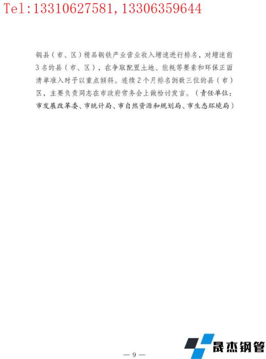 按照"五個(gè)一"工作機(jī)制,把打造精品鋼鐵為萬(wàn)億級(jí)產(chǎn)業(yè)的各項(xiàng)工作落實(shí)到各部門(mén)、各縣(市、區(qū)),結(jié)合當(dāng)?shù)貙?shí)際,"一企一策"制定具體實(shí)施方案。鼓勵(lì)和支持更多有能力、有貢獻(xiàn)的鋼鐵企業(yè)家加入各級(jí)政治組織,廣泛宣傳鋼鐵行業(yè)高質(zhì)量發(fā)展的好經(jīng)驗(yàn)好做法,維護(hù)和提升鋼鐵行業(yè)的社會(huì)形象。加強(qiáng)輿論監(jiān)督,及時(shí)曝光違法違規(guī)行為。建立督導(dǎo)幫扶機(jī)制。每月、年底對(duì)各涉鋼縣(市、區(qū))精品鋼鐵產(chǎn)業(yè)營(yíng)業(yè)收入增速進(jìn)行排名,對(duì)增速前3名的縣(市、區(qū)),在爭(zhēng)取配置土地、能耗等要素和環(huán)保正面清單準(zhǔn)入時(shí)予以重點(diǎn)傾斜。