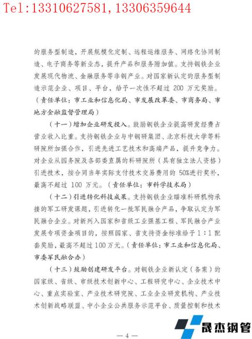 對(duì)鋼鐵企業(yè)新認(rèn)定(備案)的國(guó)家級(jí)、省級(jí)、市級(jí)技術(shù)創(chuàng)新中心、工程研究中心、企業(yè)技術(shù)中心、重點(diǎn)實(shí)驗(yàn)室、產(chǎn)業(yè)技術(shù)研究院、工業(yè)企業(yè)研發(fā)機(jī)構(gòu)、產(chǎn)業(yè)技術(shù)創(chuàng)新戰(zhàn)略聯(lián)盟、中小企業(yè)公共服務(wù)示范平臺(tái)、質(zhì)量控制和技術(shù),評(píng)價(jià)實(shí)驗(yàn)室、技術(shù)創(chuàng)新示范企業(yè)、"三品"示范企業(yè),分別給予100萬(wàn)元、20萬(wàn)元、10萬(wàn)元資金補(bǔ)助。對(duì)鋼鐵企業(yè)新認(rèn)定為高新技術(shù)企業(yè)的,給予20萬(wàn)元獎(jiǎng)勵(lì)。