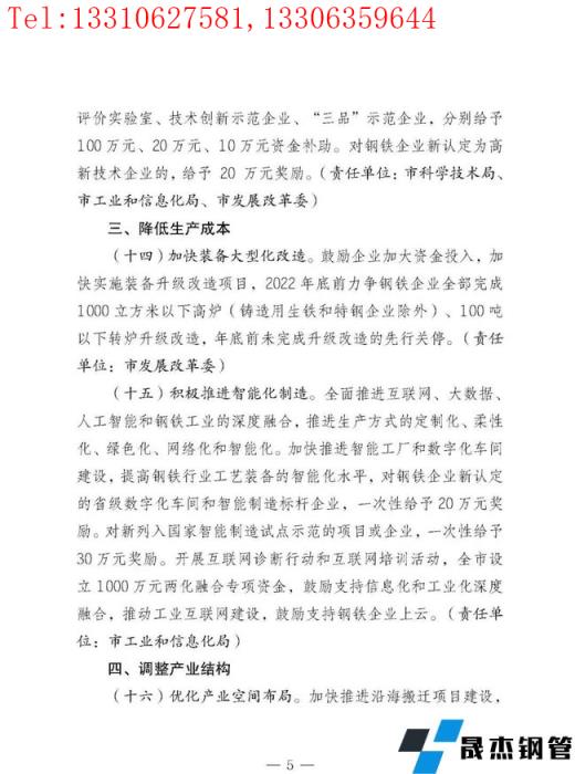 鼓勵(lì)企業(yè)加大資金投入,加快實(shí)施裝備升級(jí)改造項(xiàng)目,2022年底前力爭(zhēng)鋼鐵企業(yè)全部完成1000立方米以下高爐(鑄造用生鐵和特鋼企業(yè)除外)、100噸以下轉(zhuǎn)爐升級(jí)改造,年底前未完成升級(jí)改造的先行關(guān)停。