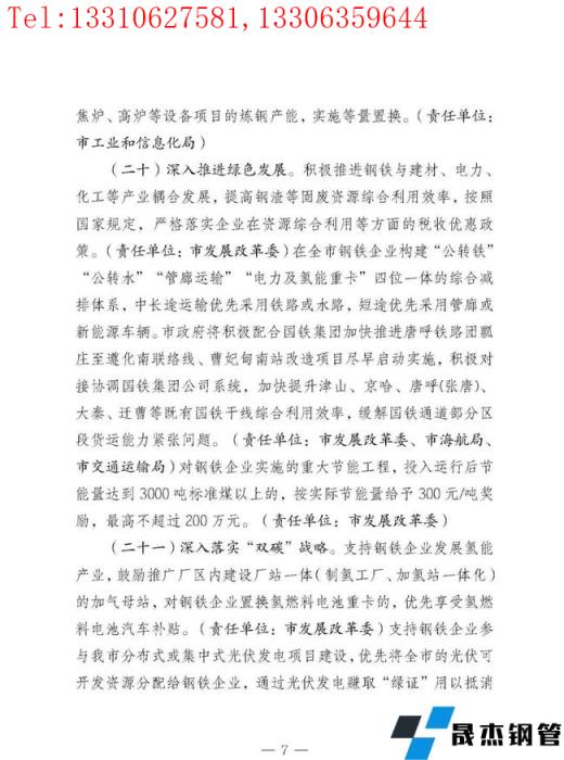 積極推進(jìn)鋼鐵與建材、電力、化工等產(chǎn)業(yè)耦合發(fā)展,提高鋼渣等固廢資源綜合利用效率,按照國(guó)家規(guī)定,嚴(yán)格落實(shí)企業(yè)在資源綜合利用等方面的稅收優(yōu)惠政策。在全市鋼鐵企業(yè)構(gòu)建"公轉(zhuǎn)鐵""公轉(zhuǎn)水""管廊運(yùn)輸""電力及氫能重卡"四位一體的綜合減排體系,中長(zhǎng)途運(yùn)輸優(yōu)先采用鐵路或水路,短途優(yōu)先采用管廊或新能源車(chē)輛。對(duì)鋼鐵企業(yè)實(shí)施的重大節(jié)能工程,投入運(yùn)行后節(jié)能量達(dá)到3000噸標(biāo)準(zhǔn)煤以上的,按實(shí)際節(jié)能量給予300元/噸獎(jiǎng)勵(lì),最高不超過(guò)200萬(wàn)元。