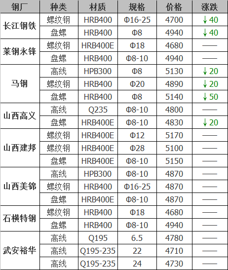 跌幅最大為長江鋼鐵建材;