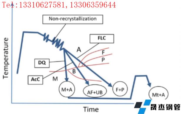 自1980年世界上第一臺在線加速冷卻裝置應用于大工業(yè)生產(chǎn)的鋼板軋機以來,[1]熱機控軋控冷技術(shù)經(jīng)歷了三代創(chuàng)新;快速層流冷卻(FLC),加速冷卻(AcC)和直接淬火(DQ)與在線回火,[2]如圖1所示。控制軋制技術(shù)主要通過細化鐵素體晶粒組織來提高韌性,[3]然而,TMCP通過奧氏體轉(zhuǎn)變?yōu)獒槧铊F素體和貝氏體轉(zhuǎn)變而獲得帶鋼的高強度,并增強了韌性。