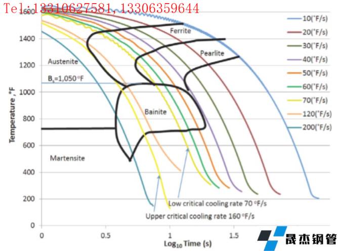 從圖6可以看出,當冷卻速率介于下臨界冷卻速率60°F/s(33.3℃/s)和上臨界冷卻速率220°F/s(122℃/s)之間時,奧氏體向針狀鐵素體和上貝氏體相變,貝氏體轉(zhuǎn)變的起始溫度為975℉(524℃)。
