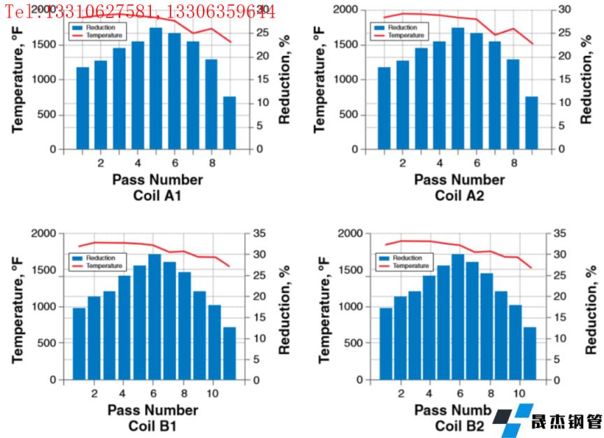 在加熱爐經(jīng)過1.5小時加熱到1700℉,圖7顯示了每道次的壓下率和溫度,從圖可以看出,相同成分的鋼卷呈現(xiàn)出相同的溫度模式,因此,它們在Steckel軋機出口處的奧氏體晶粒尺寸非常接近。