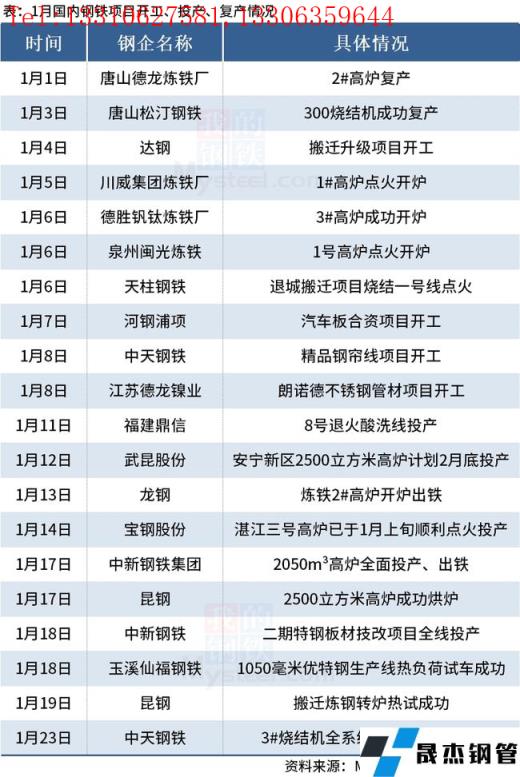 據(jù)不完全整理,2022年1月國(guó)內(nèi)20個(gè)鋼鐵項(xiàng)目開(kāi)工、投產(chǎn)和復(fù)產(chǎn)。其中,達(dá)鋼、河鋼浦項(xiàng)、中天鋼鐵和江蘇德龍鎳業(yè)等4個(gè)鋼鐵相關(guān)項(xiàng)目開(kāi)工;唐山德龍煉鐵廠和唐山松汀鋼鐵項(xiàng)目復(fù)產(chǎn);福建鼎信、寶鋼股份、中新鋼鐵和武昆股份等鋼鐵項(xiàng)目投產(chǎn)。具體內(nèi)容如下:
