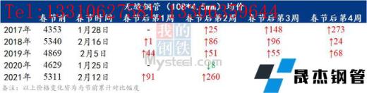 小編匯總近5年春節(jié)后四周無(wú)縫厚壁鋼管均價(jià)變化情況,以供參考。