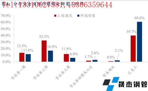 2、對(duì)于復(fù)工時(shí)間的調(diào)研發(fā)現(xiàn):今年就地過(guò)年員工的比例雖然不及去年同期,但依然處于較高水平,工人返工較為便捷,因此節(jié)后企業(yè)預(yù)計(jì)能夠全部復(fù)工的時(shí)間也較去年大體相當(dāng),目前已全面復(fù)工樣本企業(yè)263家,占比達(dá)到51.3%,節(jié)后第二周內(nèi)能夠復(fù)工的樣本企業(yè)占比高達(dá)87.5%。