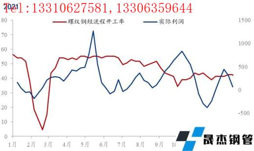 而對于2021年的數(shù)據(jù)來說無論是相關(guān)分析還是回歸分析結(jié)果表現(xiàn)出與其他年份有不同的結(jié)果,這與2021年的特殊情況有關(guān)。由于2021年螺紋鋼價格的急劇變化,導(dǎo)致電弧爐實(shí)際利潤具有了極強(qiáng)的波動性,而且由于能耗雙控,從8月底電弧爐無縫厚壁鋼管廠家被嚴(yán)格限產(chǎn),導(dǎo)致了電弧爐開工率有近20%左右的持續(xù)下降,創(chuàng)造了歷史低位,政策以及成材價格變動明顯干擾了數(shù)據(jù)的觀測,如下圖所示: