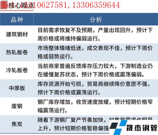 一方面,本周無(wú)縫厚壁鋼管廠家及下游終端仍處于復(fù)工復(fù)產(chǎn)進(jìn)程,但工地復(fù)工率低于去年同期,無(wú)縫厚壁鋼管廠家及社會(huì)庫(kù)存均出現(xiàn)攀升,供需壓力偏大,鋼價(jià)承壓下跌。另一方面,隨著無(wú)縫厚壁鋼管廠家持續(xù)復(fù)產(chǎn),對(duì)原燃料需求增加,鐵礦石港庫(kù)及獨(dú)立焦企庫(kù)存均出現(xiàn)下降,后期原燃料價(jià)格有支撐。此外,電弧爐無(wú)縫厚壁鋼管廠家處于盈虧邊緣,鋼價(jià)下跌空間或有限。綜合來(lái)看,短期鋼價(jià)或震蕩偏弱運(yùn)行。