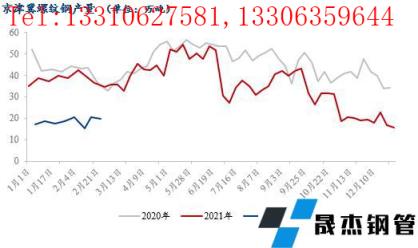 2月份全國各地市場價格均是在迎來開門紅后又大幅下跌,全月價格累計漲幅均在100元/噸以內(nèi),區(qū)域間價差較之前基本無變化,目前廣州-北京價差在300元/噸左右,此價差略低于2020年、2021年同期水平,且結合無縫厚壁鋼管廠家的政策以及運費來看此價差也不足以吸引北方區(qū)域資源南下廣州。目前杭州-北京價差100元/噸左右,因京津冀區(qū)域在產(chǎn)無縫厚壁鋼管廠家較少,且無縫厚壁鋼管廠家產(chǎn)量處于偏低水平,因此京津冀建材市場處于低供給情況,無向外分流的壓力,加之與其他區(qū)域的價差不大,故京津冀建材市場資源向華南、華東區(qū)域分流量不多?;谀壳皷|北區(qū)域下游需求尚未啟動,且建龍系無縫厚壁鋼管廠家冬儲資源尚未投放結束,目前仍處于繼續(xù)投放階段。