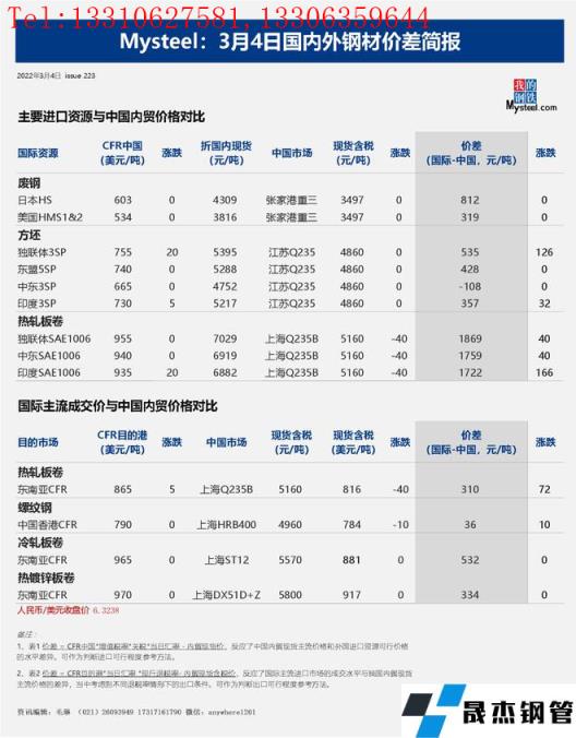 免責聲明:本網(wǎng)站(山東聊城晟杰無縫鋼管廠www.iqiwa.cn)刊載的“2022年03月04日日報:國內(nèi)外鋼材_無縫鋼管價差匯總(2022.3.4)”等均源于網(wǎng)絡(luò),版權(quán)歸原作者所有,且僅代表原作者觀點,本文所載信息僅供參考。轉(zhuǎn)載僅為學習與交流之目的,如無意中侵犯您的合法權(quán)益,請及時聯(lián)系刪除。本網(wǎng)站刊登此篇文章并不意味著本站贊同其觀點或證實其內(nèi)容的真實性,我們不對其科學性、嚴肅性等作任何形式的保證。如果侵犯了您的版權(quán),請盡快聯(lián)系我們予以撤銷,謝謝合作!