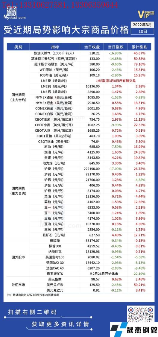 近期,受國際局勢影響,全球金融及大宗商品市場出現(xiàn)較大波動。3月10日,國際能源價格繼續(xù)大幅回落,滬鎳主力合約恢復交易后跌停。匯總情況如下:
