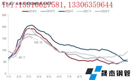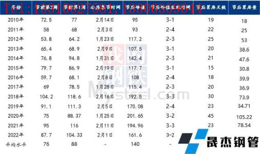 對比歷史數(shù)據(jù)來看,近10年來春節(jié)后廣州建筑厚壁無縫鋼管庫存峰值均出現(xiàn)第3-5周,累庫周期約24天左右;近5年來節(jié)后庫存累庫量明顯上升,節(jié)后峰值水平均超過150萬噸以上,而2017年之前節(jié)后庫存峰值均在140萬噸以內(nèi)。近年來,隨著經(jīng)濟(jì)發(fā)展以及供應(yīng)擴(kuò)張,春節(jié)前市場主動性冬儲積極性增加,整體的庫存量出現(xiàn)明顯上升; 雖然2022年節(jié)前價格偏高,但節(jié)前現(xiàn)貨價格上漲,帶動市場不少商家主動性囤貨、備貨,節(jié)前庫存總量并未出現(xiàn)明顯累庫現(xiàn)象。節(jié)后開市,在疫情等因素影響下,累庫速度遠(yuǎn)低于去年,今年庫存呈現(xiàn)的特點是,累庫速度快,累庫量大,周期短等特點。同時再加上今年節(jié)后不少短流程企業(yè)并未完全恢復(fù)生產(chǎn),自然資源供應(yīng)量有所減量,節(jié)后累庫低于往年,且今年峰值出現(xiàn)在3月第1周,第二周迎來庫存拐點。