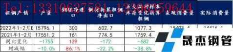 依據(jù)統(tǒng)計局發(fā)布數(shù)據(jù),2022年1-2月累計粗鋼產(chǎn)量同比降幅約10%左右,絕對量達到1.6億噸,去年同期約為1.8億噸;受今年國外形勢變化,鋼坯預估凈進口同比增幅達到86%,厚壁無縫鋼管折算粗鋼凈出口降幅達到22%,因此測算粗鋼表觀消費量達到1.55億噸,同比降幅約8.6%;另外考慮到庫存變化因素,將其折算至粗鋼,測算粗鋼實際消費量達到1.44億噸,同比降幅約5%,需求降幅表現(xiàn)明顯好于市場預期。