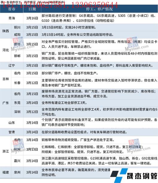 截至3月16日,匯總了10個(gè)省份最新停工停產(chǎn)信息。其中,河北省于3月15日宣布,除張家口、承德、秦皇島市按有關(guān)規(guī)定供暖時(shí)間外,其他法定3月15日停暖的地方供暖時(shí)間統(tǒng)一延長(zhǎng)至3月31日24時(shí)。陜西省銅川市于15日宣布全市范圍內(nèi)實(shí)施24小時(shí)交通管制;咸陽(yáng)市15日宣布全市所有公交營(yíng)運(yùn)路線暫時(shí)停運(yùn)。吉林省部分無(wú)縫厚壁鋼管廠家停產(chǎn),螺紋、盤(pán)線不飽和生產(chǎn)。與此同時(shí),全國(guó)其他地區(qū)鋼貿(mào)交易也受到影響,部分工地開(kāi)始停工,物流運(yùn)輸暫停服務(wù)。具體情況如下: