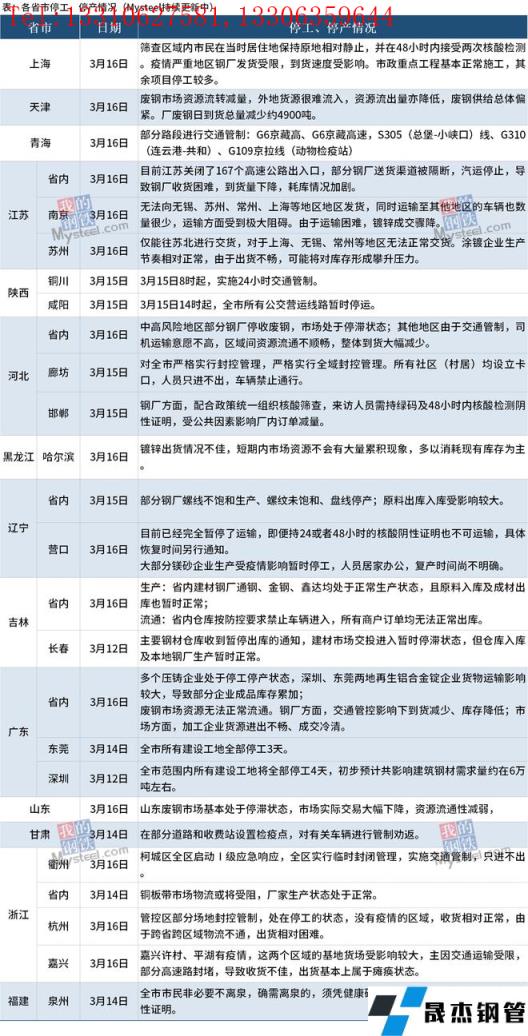 截至3月17日,匯總14個(gè)省份停工停產(chǎn)最新信息。其中,上海市疫情嚴(yán)重地區(qū)無縫厚壁鋼管廠家發(fā)貨受限,到貨速度受影響;市政重點(diǎn)工程基本正常施工,其余項(xiàng)目停工較多。河北省內(nèi)中高風(fēng)險(xiǎn)地區(qū)部分無縫厚壁鋼管廠家停收廢鋼 ,市場處于停滯狀態(tài);其他地區(qū)由于交通管制,司機(jī)運(yùn)輸意愿不高,區(qū)域間資源流通不順暢,整體到貨大幅減少。廣東省內(nèi)多個(gè)壓鑄企業(yè)處于停工停產(chǎn)狀態(tài),深圳、東莞兩地再生鋁合金錠企業(yè)貨物運(yùn)輸影響較大,導(dǎo)致部分企業(yè)成品庫存累加;吉林省省內(nèi)建材無縫厚壁鋼管廠家通鋼、金鋼、鑫達(dá)均處于正常生產(chǎn)狀態(tài),且原料入庫及成材出庫也暫時(shí)正常;省內(nèi)倉庫按防控要求禁止車輛進(jìn)入,所有商戶訂單均無法正常出庫。具體情況如下: