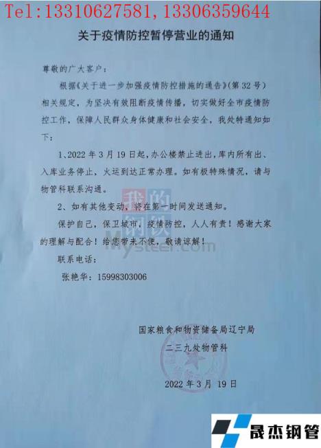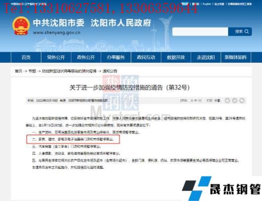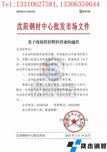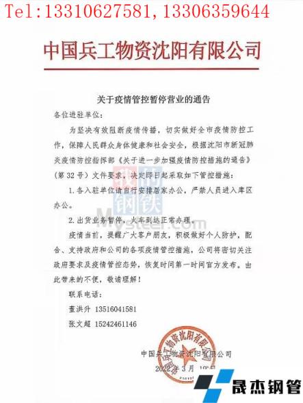 目前沈陽(yáng)厚壁無(wú)縫鋼管中心批發(fā)市場(chǎng)已發(fā)布通告,19日起北一西路東西樓試試封閉管控、嚴(yán)禁人員進(jìn)入辦公,出庫(kù)業(yè)務(wù)暫停、火車(chē)到達(dá)正常辦理;中國(guó)兵工物資125庫(kù)通告19日起嚴(yán)禁人員進(jìn)入庫(kù)區(qū)辦公,出庫(kù)業(yè)務(wù)暫停、火車(chē)到達(dá)正常辦理;國(guó)家糧食和物資儲(chǔ)備局遼寧局二三九處通告19日起辦公樓嚴(yán)禁進(jìn)出,庫(kù)內(nèi)所有出入庫(kù)業(yè)務(wù)暫停、火運(yùn)到達(dá)正常辦理。市內(nèi)其他主要厚壁無(wú)縫鋼管市場(chǎng)反饋暫時(shí)正常辦公及出庫(kù),但從防控指揮部通告內(nèi)容來(lái)看、也有暫停營(yíng)業(yè)的傾向。(通告見(jiàn)文末圖片)