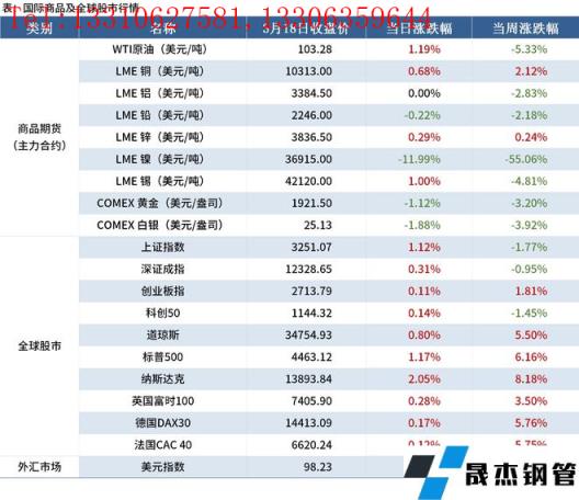 當(dāng)周,商品期貨方面,原油、鋁、黃金價格明顯下跌,倫鎳開盤后連續(xù)3日跌停,周度大跌55.06%;商品方面僅銅、鋅價格小幅上漲。全球股市方面,中國股市下跌,歐美股市上漲,其中,納斯達(dá)克指數(shù)漲幅逾8%。外匯市場方面,美元指數(shù)收于98.23,下跌0.91%。