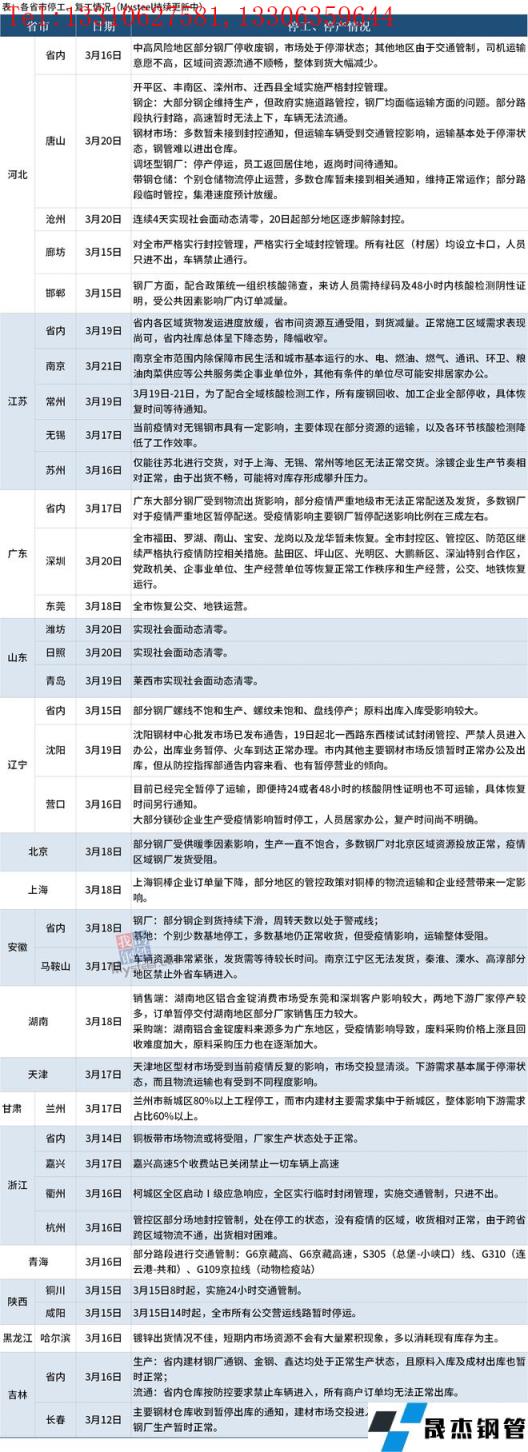 截至3月21日,匯總了16個省份停工停產(chǎn)最新信息。其中,3月21日,南京全市范圍內(nèi)除保障市民生活和城市基本運(yùn)行的水、電、燃油、燃?xì)?、通訊、環(huán)衛(wèi)、糧油肉菜供應(yīng)等公共服務(wù)類企事業(yè)單位外,其他有條件的單位盡可能安排居家辦公。3 月20日,唐山開平區(qū)、豐南區(qū)、灤州市、遷西縣全域?qū)嵤﹪?yán)格封控管理;大部分鋼企維持生產(chǎn),但政府實(shí)施道路管控,無縫厚壁鋼管廠家均面臨運(yùn)輸方面的問題。深圳全市福田、羅湖、南山、寶安、龍崗以及龍華暫未恢復(fù),全市封控區(qū)、管控區(qū)、防范區(qū)繼續(xù)嚴(yán)格執(zhí)行疫情防控相關(guān)措施。山東濰坊日照、青島萊西市實(shí)現(xiàn)社會面動態(tài)清零。河北滄州連續(xù)4天實(shí)現(xiàn)社會面動態(tài)清零,3月20日起部分地區(qū)逐步解除封控。具體情況如下: