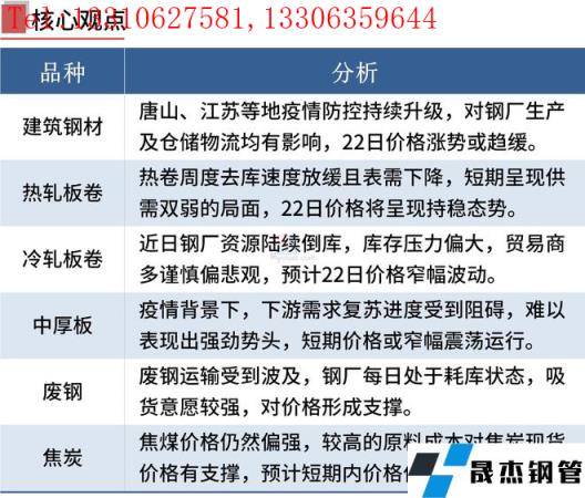 國(guó)內(nèi)多省市升級(jí)調(diào)整疫情防控,下游工地施工進(jìn)度放緩,導(dǎo)致鋼市成交量下滑。無(wú)縫厚壁鋼管廠家生產(chǎn)影響相對(duì)較小,但若唐山交通管制持續(xù),不排除高爐廠也會(huì)減產(chǎn)或停產(chǎn)。短期內(nèi),鋼市供需基本面偏弱,成本支撐力度較強(qiáng)。在重大利好政策出臺(tái)以及全國(guó)疫情得到有效控制之前,鋼價(jià)或繼續(xù)震蕩運(yùn)行。