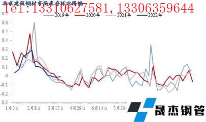 2022年北京建筑厚壁無(wú)縫鋼管市場(chǎng)庫(kù)存量在春節(jié)后的第5周達(dá)到峰值,較往年累庫(kù)周期延長(zhǎng)了1-2周,之后庫(kù)存量進(jìn)入緩慢去化階段,但是從近幾周庫(kù)存去化情況來(lái)看,庫(kù)存下降情況不及預(yù)期。截止到3月24日,北京建筑厚壁無(wú)縫鋼管市場(chǎng)庫(kù)存量82.18萬(wàn)噸,周環(huán)比降0.72%,2019-2021年同期的周環(huán)比降幅分別為7.9%、5.3%、8%;另外目前市場(chǎng)庫(kù)存量較今年庫(kù)存高點(diǎn)下降了2.8%,而2019-2021年同期庫(kù)存量較當(dāng)年的庫(kù)存峰值分別下降了17.8%、9.3%、15.5%。庫(kù)存下降除供應(yīng)量環(huán)比略增外,主因是需求下降,且受疫情影響資源向外分流困難。
