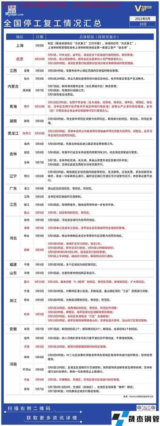 截至5月10日,據(jù)不完全統(tǒng)計,共有17個省份發(fā)布了停工復工最新信息。5月9日,北京豐臺區(qū)、昌平區(qū)、海淀區(qū)多個區(qū)域進行臨時封控、管控管理。邯鄲多區(qū)域?qū)嵭蟹饪毓芾怼?月10日1時起,西寧市全域采取從嚴從緊的防控措施,全市(區(qū))行政及各企事業(yè)單位和團體均實行居家辦公。具體情況如下: