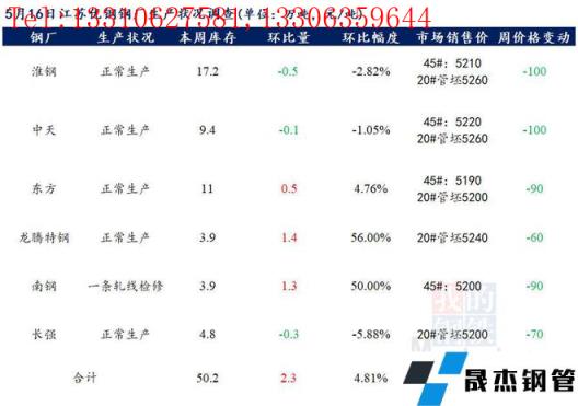 江蘇優(yōu)特?zé)o縫厚壁鋼管廠(chǎng)家棒材總庫(kù)存50.2萬(wàn)噸,較上周增加2.3萬(wàn)噸,環(huán)比增4.81%,較去年同期增加13.41萬(wàn)噸,同比增36.45%。