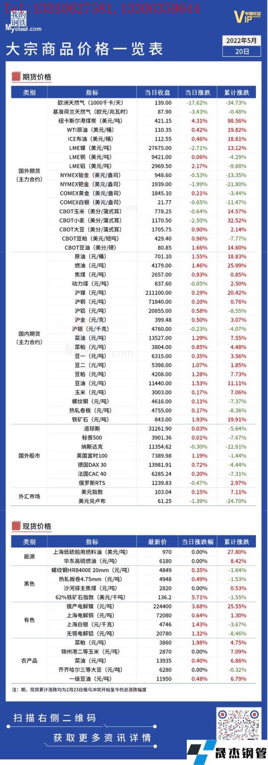 免責聲明:本網站(山東聊城晟杰無縫鋼管廠www.iqiwa.cn)刊載的“俄烏局勢丨大宗商品價格一覽表(5月20日)”等均源于網絡,版權歸原作者所有,且僅代表原作者觀點,本文所載信息僅供參考。轉載僅為學習與交流之目的,如無意中侵犯您的合法權益,請及時聯(lián)系刪除。本網站刊登此篇文章并不意味著本站贊同其觀點或證實其內容的真實性,我們不對其科學性、嚴肅性等作任何形式的保證。如果侵犯了您的版權,請盡快聯(lián)系我們予以撤銷,謝謝合作!