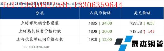 5月23日普鋼絕對價格指數(shù)變化:綜合指數(shù)5094.32,下跌8.39;螺紋鋼指數(shù)4842.56,下跌9.26;線材指數(shù)5239.01,下跌5.27;熱軋板卷指數(shù)4888.7,下跌13.55;冷軋板卷指數(shù)5396.14,下跌4.01;中厚板指數(shù)5104.15,下跌8.67。