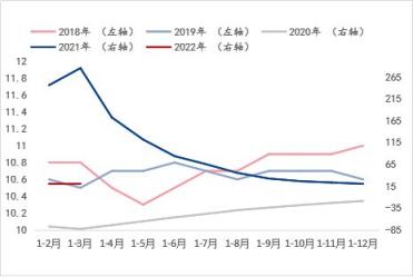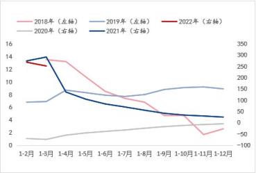 從基礎設施投資增速和房地產(chǎn)開發(fā)投資增速來看(涉及到對應年份走勢使用左右軸的區(qū)分目的與固定資產(chǎn)投資增速指標的說明一致),兩個指標在2020年-2021年非正常環(huán)境條件下的年份增速趨勢基本一致,但在正常環(huán)境條件下的年份增速可以看到,伴隨湖北省每年所需完成的經(jīng)濟增長目標的大背景下,此兩項指標的增速表現(xiàn)呈現(xiàn)此消彼長的走勢。而結(jié)合斜率來看,進入2022年1-3月,基礎設施投資增速呈現(xiàn)明顯快速恢復或釋放態(tài)勢,而房地產(chǎn)開發(fā)投資增速則呈現(xiàn)明顯放緩態(tài)勢。由此看來,對于建筑厚壁無縫鋼管品種的需求將在房地產(chǎn)板塊的萎縮預期更為明顯,這與目前所處的房地產(chǎn)調(diào)控政策背景是相符的,即便有所改善,筆者認為仍暫難有實質(zhì)上的新刺激,而基礎設施投資或?qū)⑹峭械椎闹我蛩刂?。綜合來看,湖北省宏觀指標數(shù)據(jù)的預期演變表明對于建筑厚壁無縫鋼管品種的需求預期呈現(xiàn)萎縮態(tài)勢,這與產(chǎn)能角度的供應增加形成供需矛盾加劇的預期,因此這是導致建筑厚壁無縫鋼管價格偏低運行的外因之一。