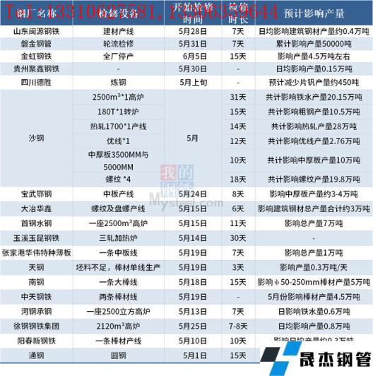 據(jù)不完全統(tǒng)計(jì),5月國(guó)內(nèi)18家無(wú)縫厚壁鋼管廠(chǎng)家發(fā)布檢修計(jì)劃。其中,磐金厚壁鋼管各分廠(chǎng)計(jì)劃將于5月31日至6月6日進(jìn)行輪流檢修,預(yù)計(jì)將累計(jì)影響產(chǎn)量50000噸。