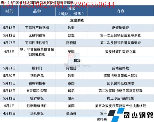 據不完全統(tǒng)計,2022年4-5月中國貿易救濟信息網陸續(xù)公布了11起國外對中國鋼鐵產品發(fā)起的反傾銷、反補貼調查或裁決。涉案品種包括可再裝不銹鋼桶、無縫鋼鐵管、可鍛性鑄鐵管件、鋼制門、鍍錫鋼板卷、H型鋼和I型鋼、鍍鋅鋼板和熱軋鋼板等。具體如下: